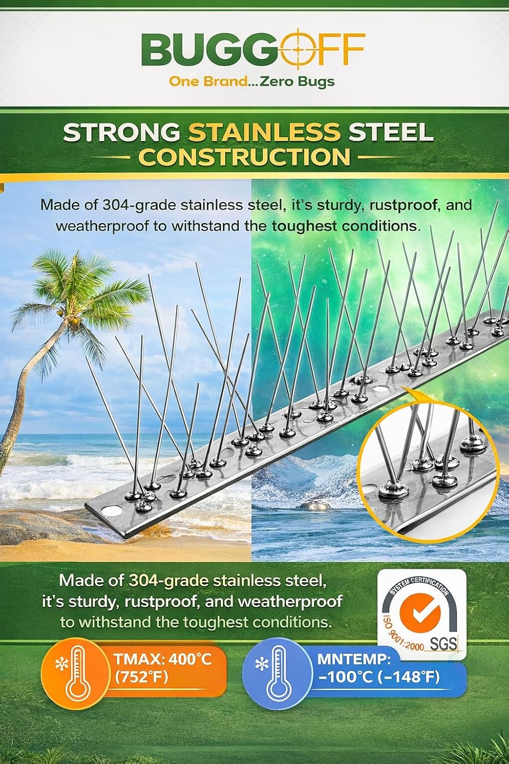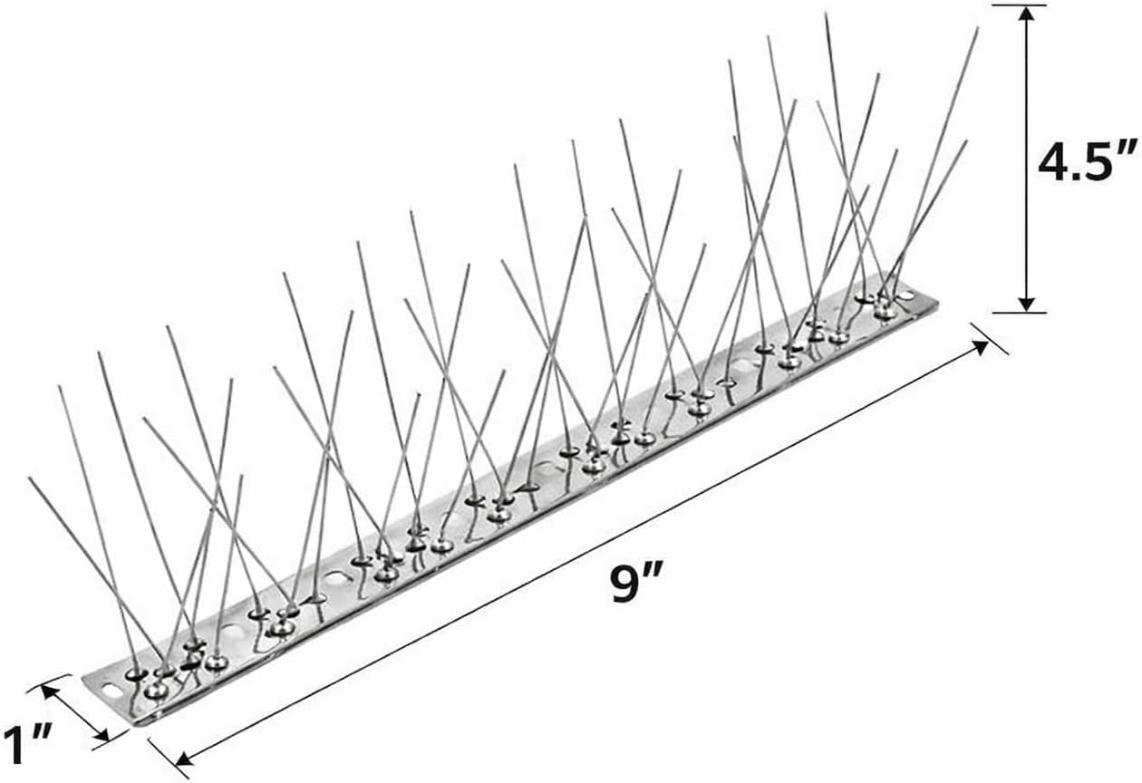 Protect your property effectively with these professional-grade bird deterrent spikes. The stainless steel construction ensures lasting durability while creating an uninviting surface that prevents birds from landing and roosting. These anti-bird strips are specially designed for easy installation on roofs, fences, ledges, and other surfaces where birds commonly perch. Each strip features multiple rows of precisely angled spikes that provide maximum coverage and effectiveness. The silver finish maintains a clean, professional appearance while blending seamlessly with most architectural elements. These versatile deterrent strips offer a practical solution for both residential and commercial properties dealing with nuisance birds. The sturdy base allows for secure mounting, while the strategic spike placement ensures consistent coverage across the protected area. Perfect for property managers, homeowners, and facility maintenance professionals looking for a long-lasting bird control solution. Installation is straightforward, allowing you to quickly secure problem areas and prevent damage from bird activity.