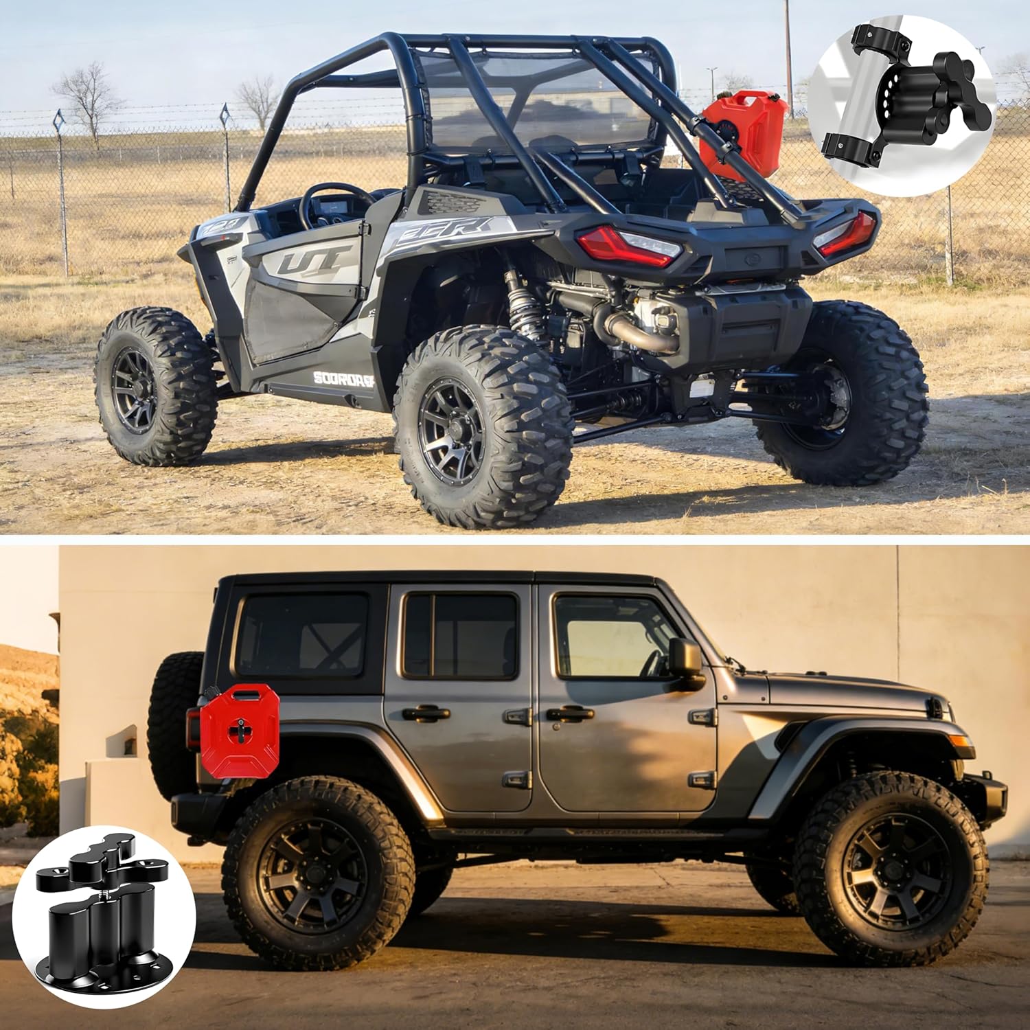 Designed specifically for riders and drivers passionate about off-road adventures and outdoor work, this gas can holder is the ideal solution for safely transporting your extra fuel. It cleverly combines high security, installation flexibility, and broad compatibility, allowing you to focus on your exploration with complete peace of mind.✔Core Features:●Dual-Pronged Security: The integrated key-locking system effectively prevents fuel theft. More importantly, it securely locks the fuel tank to its mount during vehicle jolts, jumps, or traversal of extreme terrain. This eliminates any risk of loosening or detachment caused by vibration, safeguarding both your safety and that of vehicles behind you.●Dual-Mode Mounting, Your Way: Its unique two-in-one design delivers unmatched installation flexibility. Choose to mount the base in your truck bed, on the vehicle body, or any flat surface—or simply use its clamp function to secure it firmly to roll cage tubes ranging from 1 to 2 inches. One product, two options—effortlessly adapt to any mounting scenario.●Built to last, enduring like new: Crafted from premium aluminum alloy as the primary material, it delivers robust support while significantly reducing weight. The surface undergoes a professional black coating treatment, offering not only a sleek appearance but also resilience against common off-road hazards like mud and sand abrasion, rain erosion, and UV exposure—ensuring the rack maintains its pristine condition over time.●Simple and time-saving, non-destructive installation: Say goodbye to tedious drilling and welding! Our bar-mounting solution is extremely straightforward: Simply place the included rubber washers inside the bracket's inner ring to enhance friction and protect the tube paint, then slide the bracket over the roll cage tube and tighten the bolts to complete the installation. The entire process requires no permanent modifications to your vehicle, ensuring a truly damage-free installation that saves time while preserving your car's integrity.●Wide compatibility, one mount for multiple uses: Featuring an adjustable clamp design, this mount perfectly accommodates roll cage tubes of various diameters, including 1-inch, 1.5-inch, 1.75-inch, and 2-inch. Compatible with Polaris RZR or Talon, Can-Am Maverick X3 or Commander, Honda Pioneer, Yamaha Wolverine, Kawasaki Teryx or Mule, or other mainstream UTV, ATV, or off-road motorcycle brands—as long as it features a cage-style roll bar structure, it becomes a reliable partner.